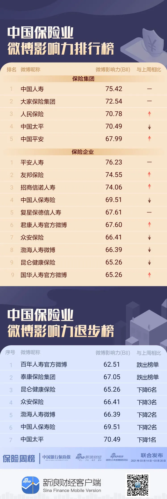 “中国保险业微博影响力排行榜”采用周榜的形式,由中国银行保险报联合新浪财经共同发布。此外,我们还联合推出“中国银行业微博影响力排行榜”、“中国信托业微博影响力排行榜”,数据来源为新浪微热点大数据研究院&铀媒。